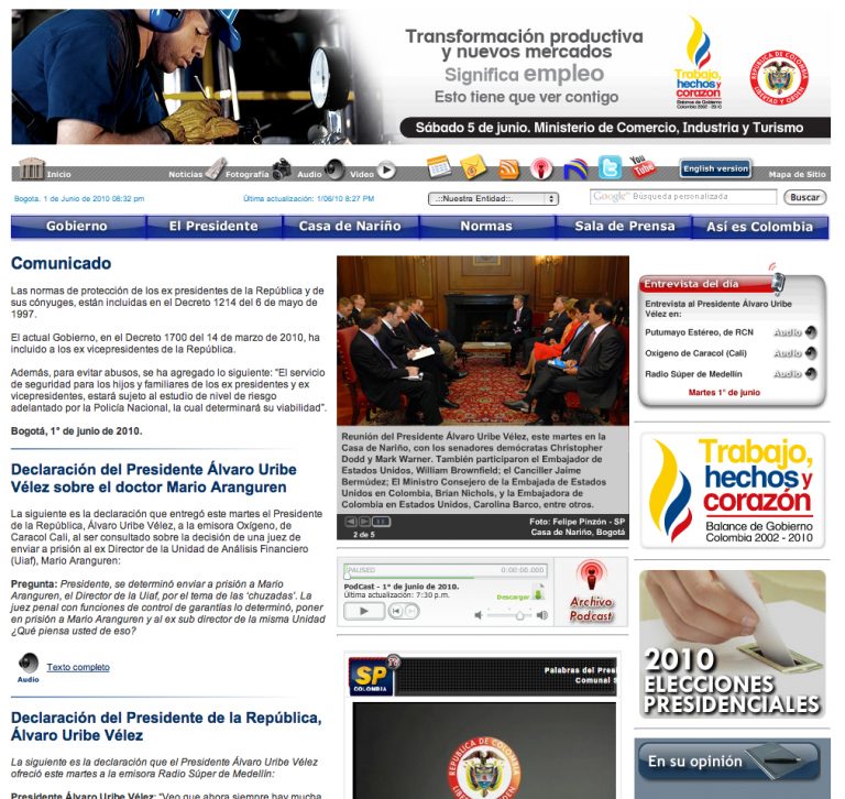 Conception de sites Web pour le portail gouvernemental de la présidence de la République de Colombie (2006 -2010). HTML – CSShttp://historico.presidencia.gov.co/index_final.html