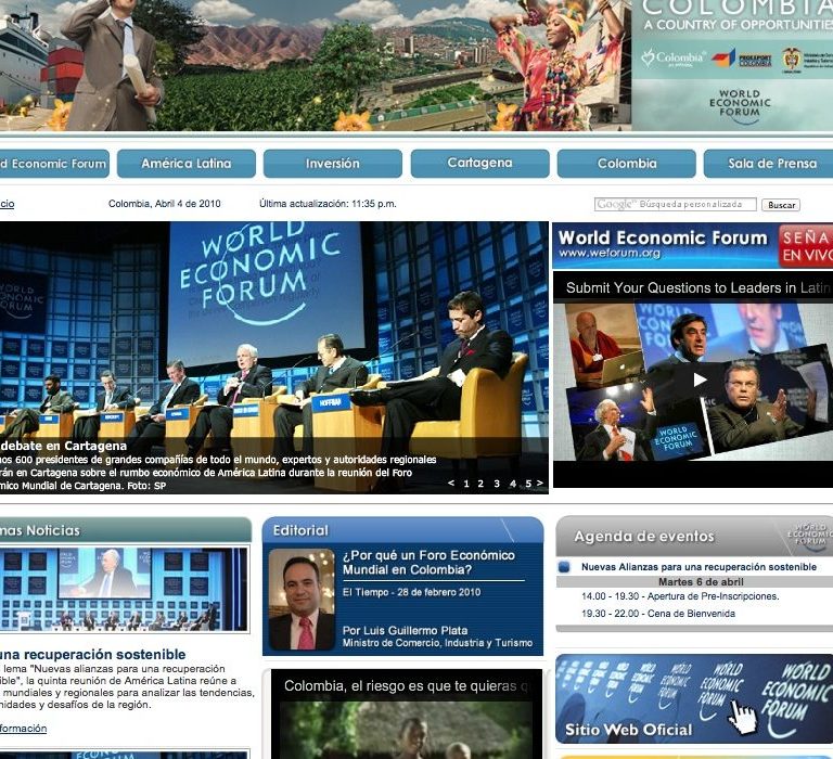 Conception et développement du portail web destiné à stocker toutes les informations officielles de l’événement World Economic Forum Colombia en 2010. Mis en œuvre en Html + CSS Contenu publié temporairement pour l’année 2010 dans : www.wefcolombia.com