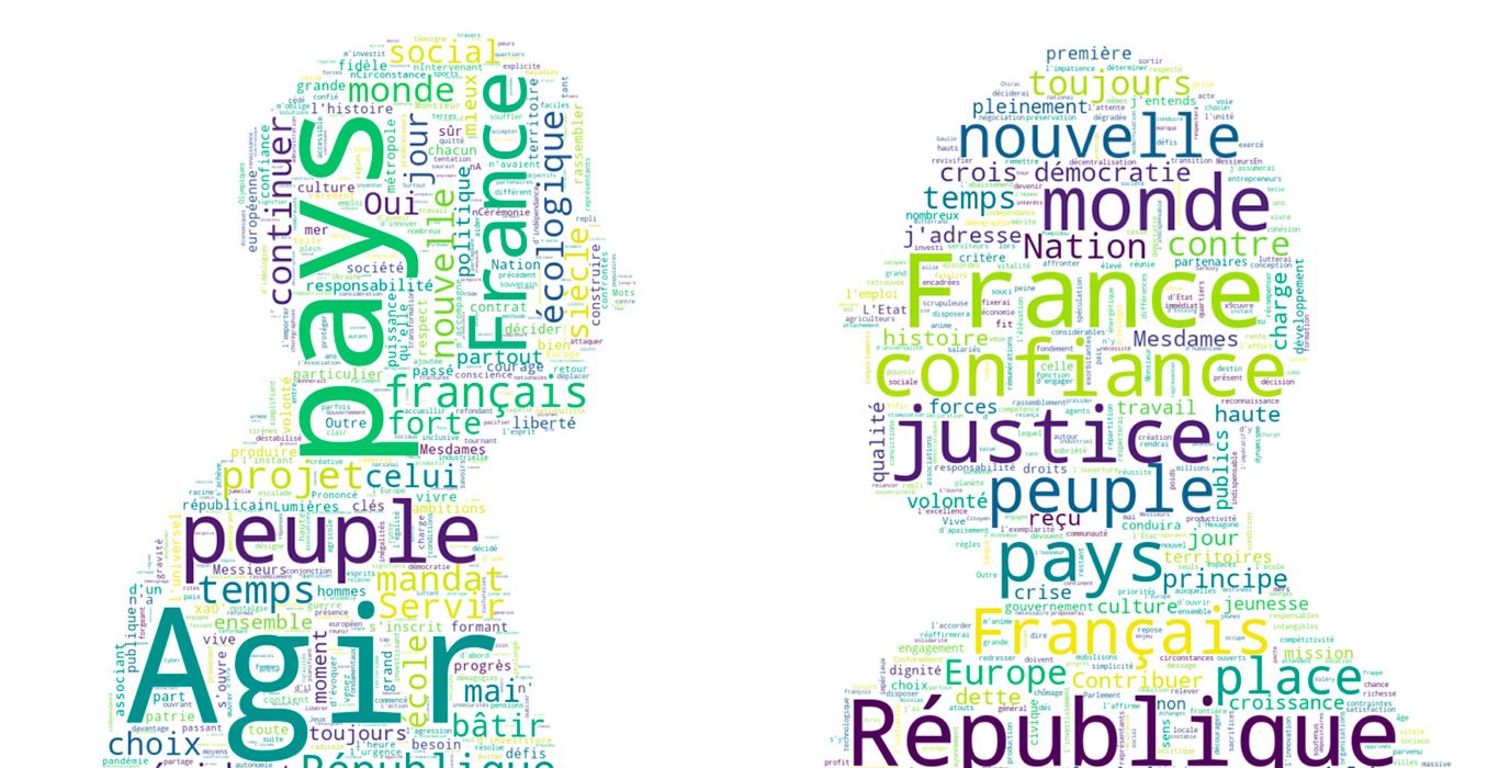 Nous proposons d’utiliser la silhouette de chaque président comme conteneur de notre Word Cloud, ce qui nous permet d’associer les données à leur origine de manière visuelle.