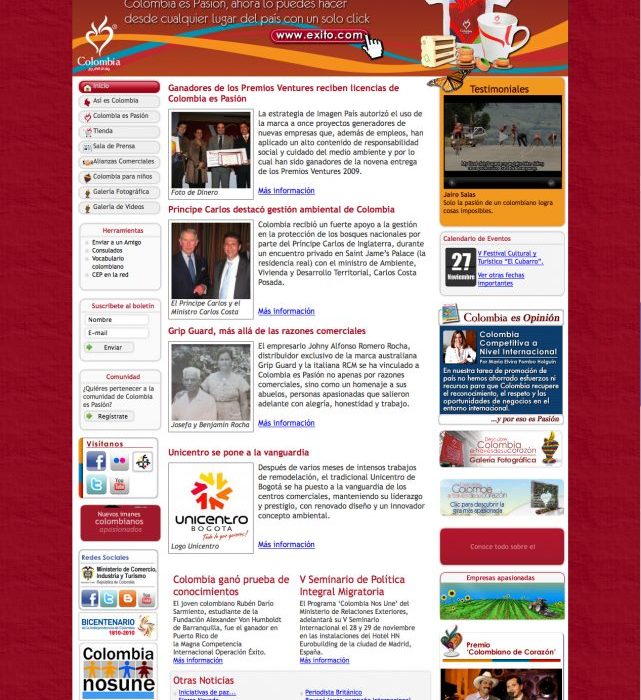 Conception du site web du portail officiel de la marque pays Colombia is Passion (2009-2010).