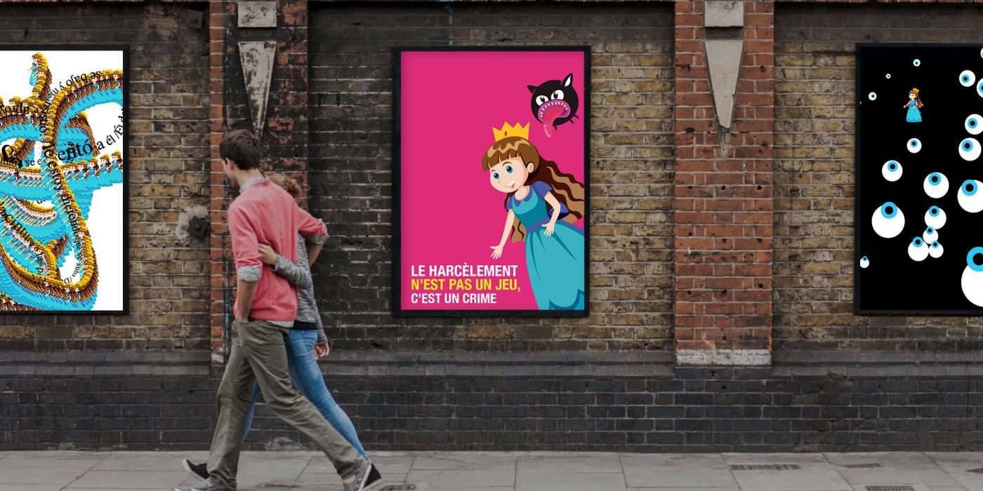 Avec la position de la souris, nous définissons l’emplacement de la princesse (caractère #1) et la direction du regard des yeux (caractère #2) au sein de l’interface. Après le temps imparti, le scénario se termine par le message « Le harcèlement n’est pas un jeu, c’est un crime ».